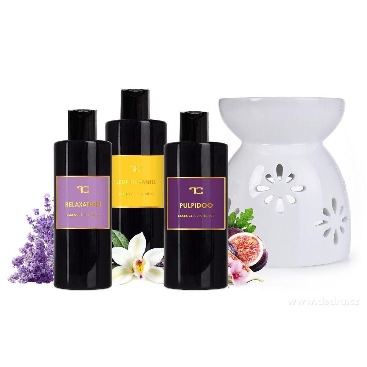 Sada obsahuje: 1 x 100 ml parfémová esence do aromalamp a difuzérů RELAXATION, 1 x 100 ml parfémová esence do aromalamp a difuzérů FLEUR DE VANILLE, 1 x 100 ml parfémová esence do aromalamp a difuzérů PULPIDOO + ZDARMA 1 x CAVOLIA | Aromalampa s květinovým dekorem & jeskynním tvarem | lesklá bílá keramika.