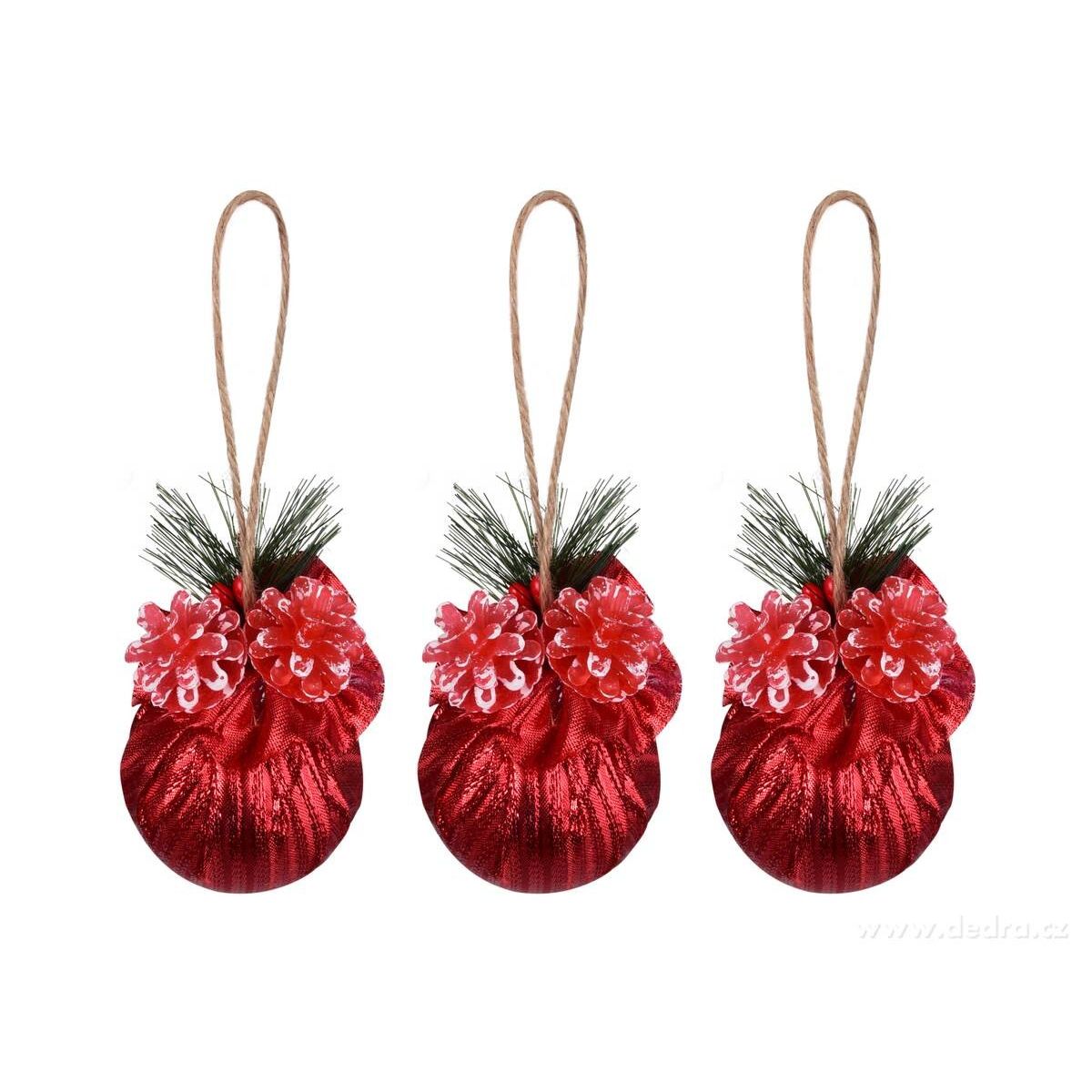 3 ks koulí s dekorativní červenou látkou a přízdobou. Průměr všech 6 cm.