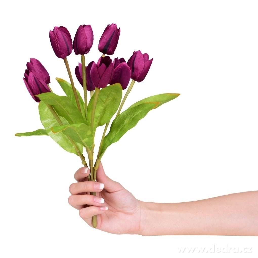 Kytice TULIPÁNŮ tmavě fialová, s 9 květy o průměru cca 2,5 cm,výška cca 31 cm.