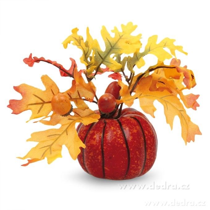 Ozdobná dekorace v podzimních barvách laděná do oranžových tónů. S bohatou přízdobou ve stojánku ve tvaru dýně. Výška cca 21 cm.
