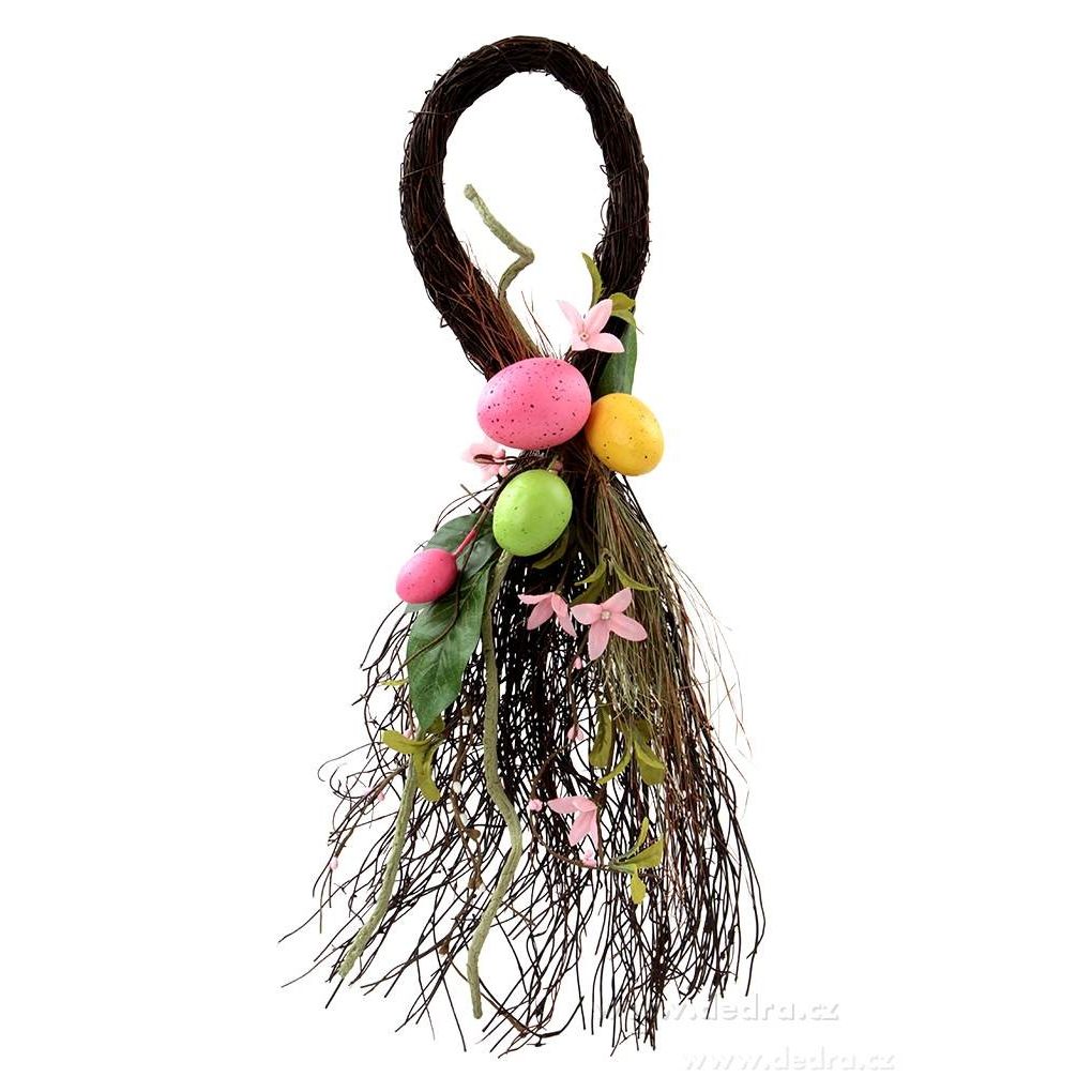 XL Dekorace ve tvaru kapky s jarní tématikou z proutí s barevnými decentními vajíčky a zelenou přízdobou s drobnými růžovými kvítky. Vhodné k zavěšení na dveře či zeď, ale i k položení na stůl či komodu a skříňku. Celková délka 53 cm (!!!).