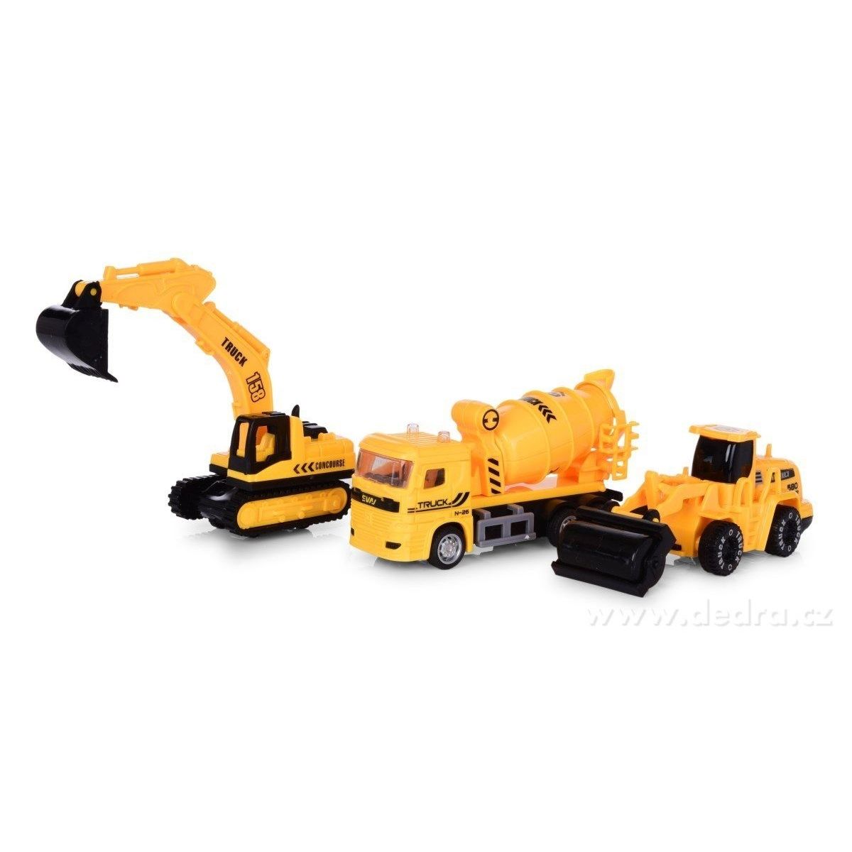 3 KS STAVEBNÍCH AUT - míchačka, válec, pásový bagr, na setrvačník.Věrné kopie skutečných strojů. Vyrobeno z odolného plastu.