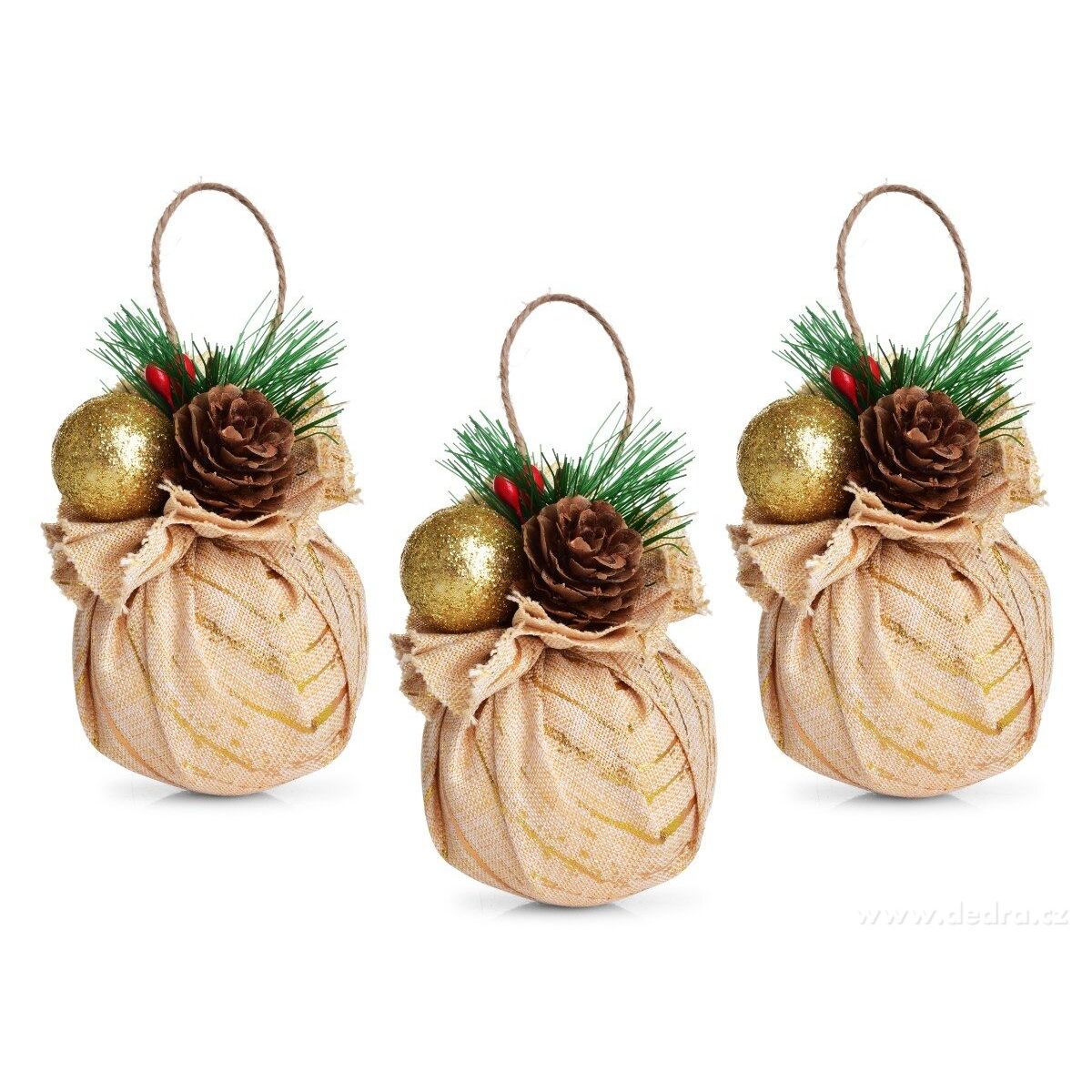 Technické informace: Materiál: plastová koule potažená režnou látkou, doplněná přízdobou. Dekorace: přírodní šiška, jehličí, zlatá ozdoba. Rozměry: průměr cca 6 cm. Balení: sada 3 ks. Použití: závěsná dekorace nebo součást aranžmá.