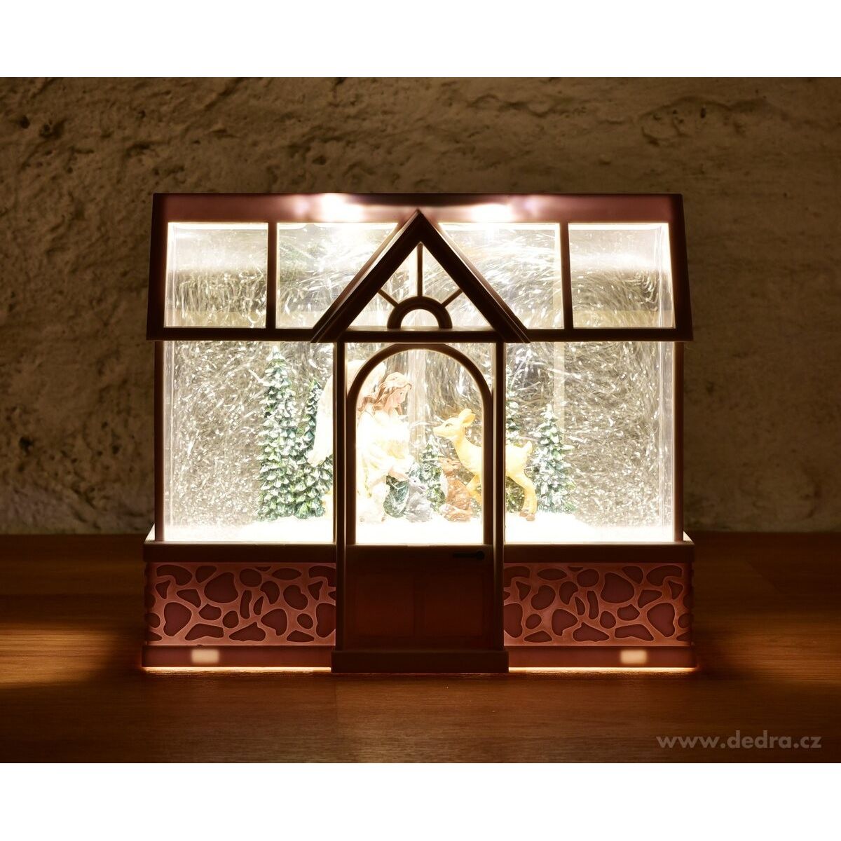 TŘPYTIVÝ SKLENÍK SNĚŽENÍ | svítící LED domeček s melodií a poletujícími vločkami | 23 cm