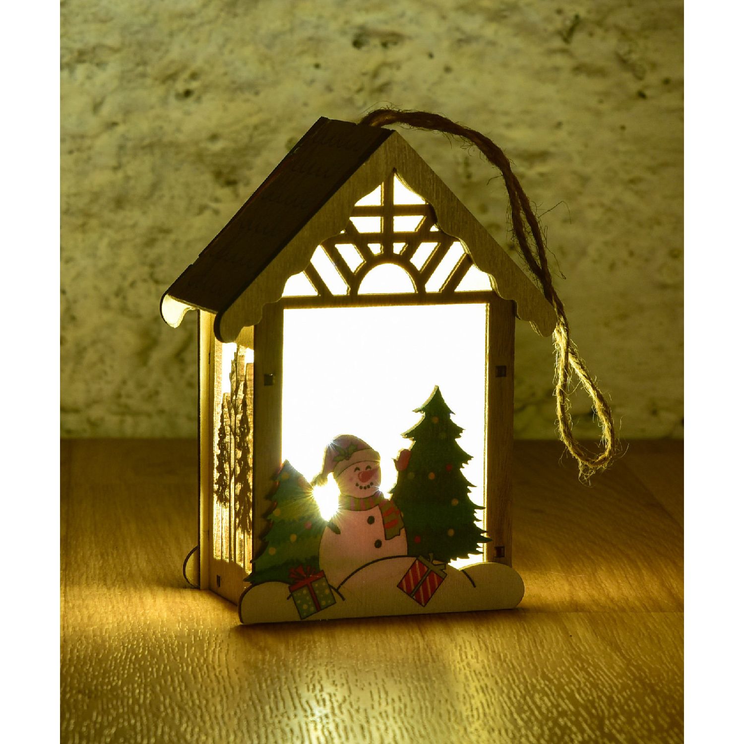 SVÍTÍCÍ ZIMNÍ DOMEK | dřevěná dekorace se sněhulákem a LED světlem | 14 cm