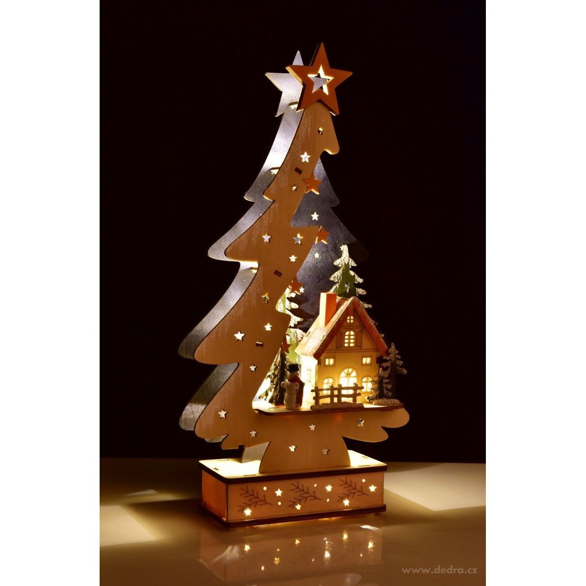 Dřevěná dekorace ve tvaru vánočního stromku skrývá zasněženou chaloupku, sněhuláka a svítící LED osvětlení. Výška 40 cm. Jemné detaily a přírodní provedení přinášejí do domova harmonii a atmosféru tradičních Vánoc.