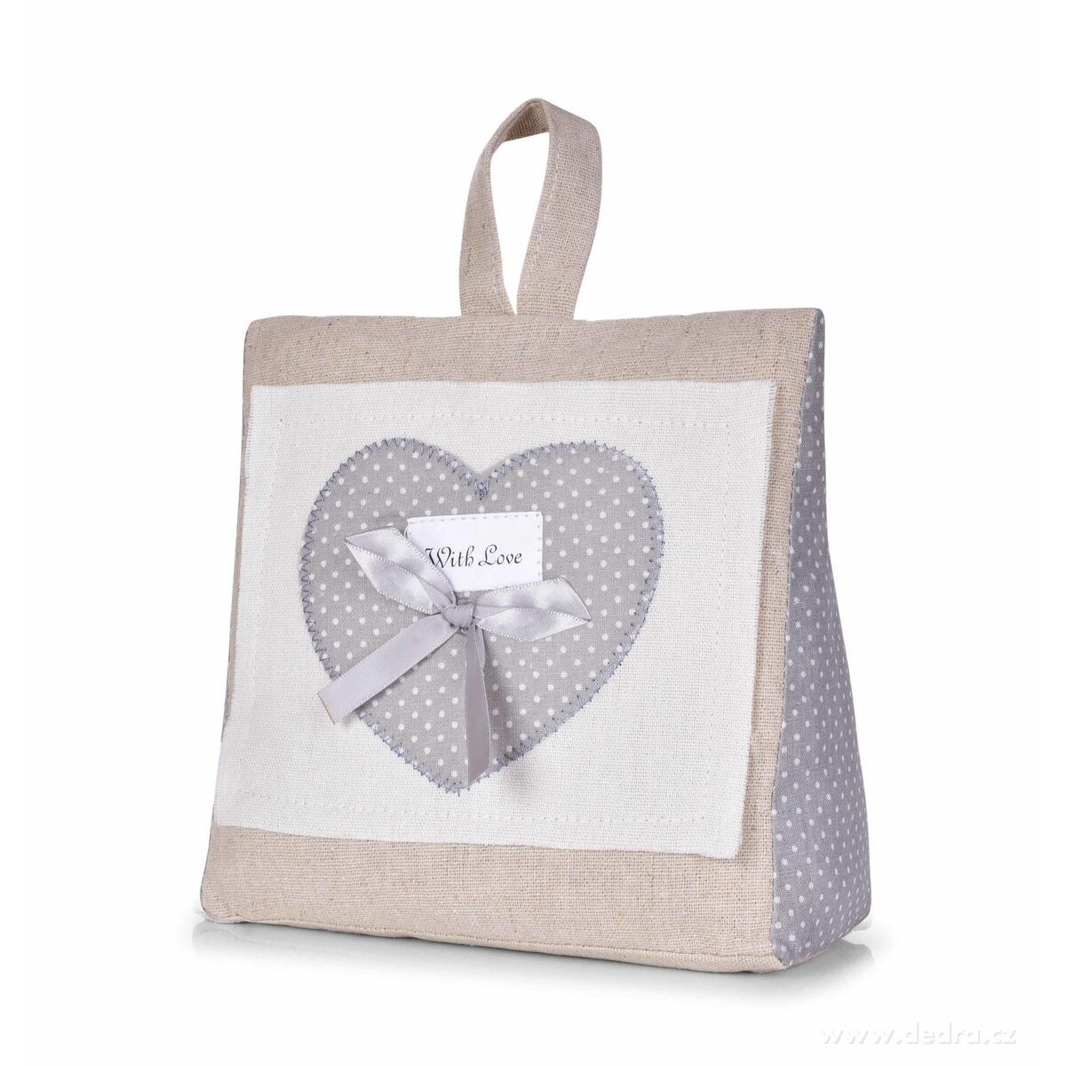 Dveřní textilní zarážka WITH LOVE, vypolstrovaná,uvnitř s kuličkami pro lepší stabilitu a zatížení, s látkovým uchemna přenášení. Rozměry cca š 18 x h 8 x v 16 cm, hmotnost cca 922 g.