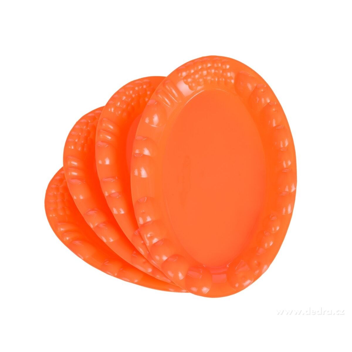 Sada 4 ks oválných talířů z odolného plastu, s ozdobnými prolisy na okrajích talířů. Rozměry: š 25,3 x h 16,8 x v 2 cm.