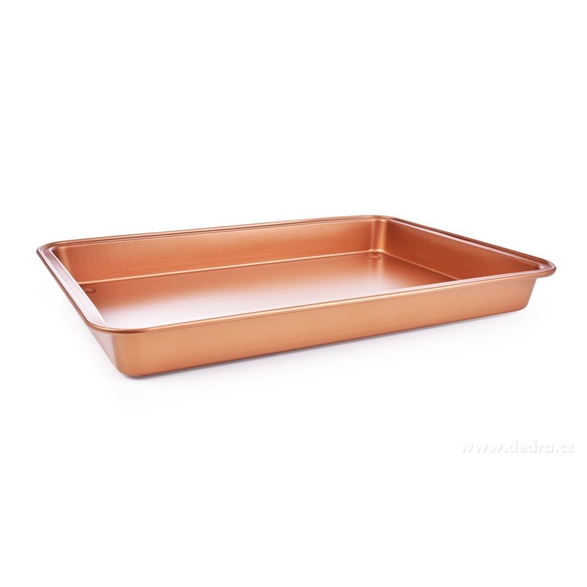 HLUBOKÝ PLECH, objem 3900 ml, z oceli se zlato měděným prémiovým nepřilnavým povrchem BIOPAN® GOLD, který se snadno udržuje a má dlouhou životnost. Prémiový BIOPAN® GOLD snadné vyjmutí hotových dobrot z forem.š 42 x h 29 x v 4,5 cm.