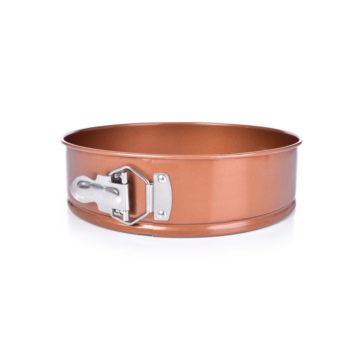 Kulatá pečící rozkládací forma z oceli se zlato měděným prémiovým nepřilnavým povrchem BIOPAN® GOLD, který se snadno udržuje a má dlouhou životnost. Prémiový BIOPAN® GOLD snadné vyjmutí hotových dobrot z forem.