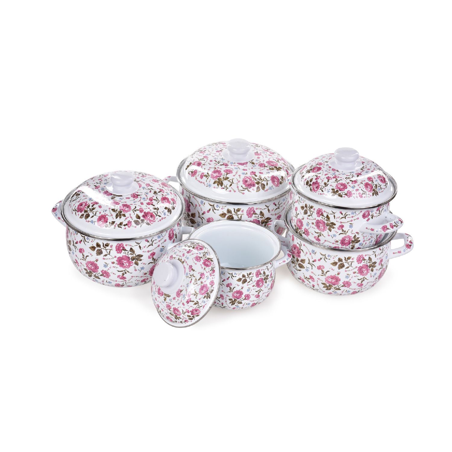 10 dílná sada smaltovaných hrnců s poklicemi. S květinovým motivem.