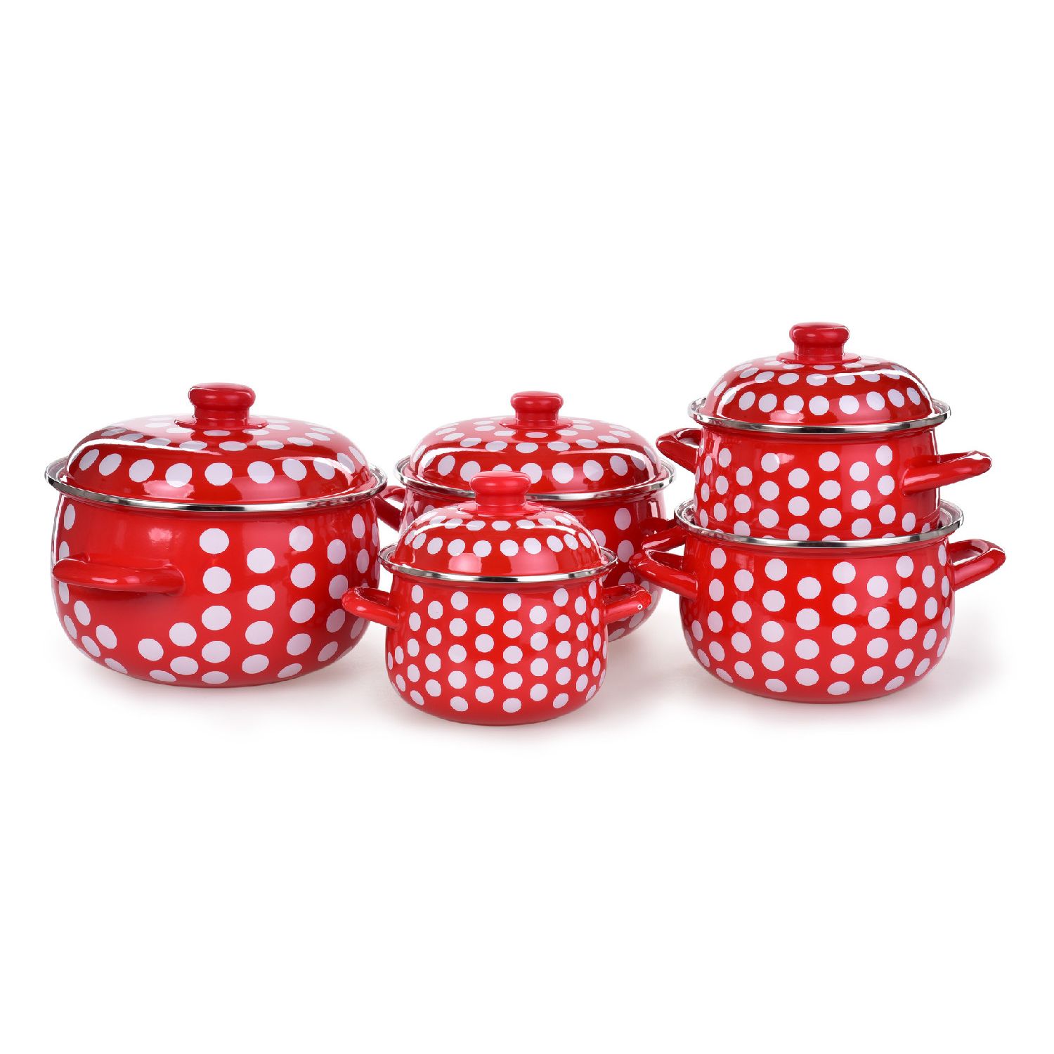 10 dílná sada smaltovaných hrnců s poklicemi. Červené s puntíky.