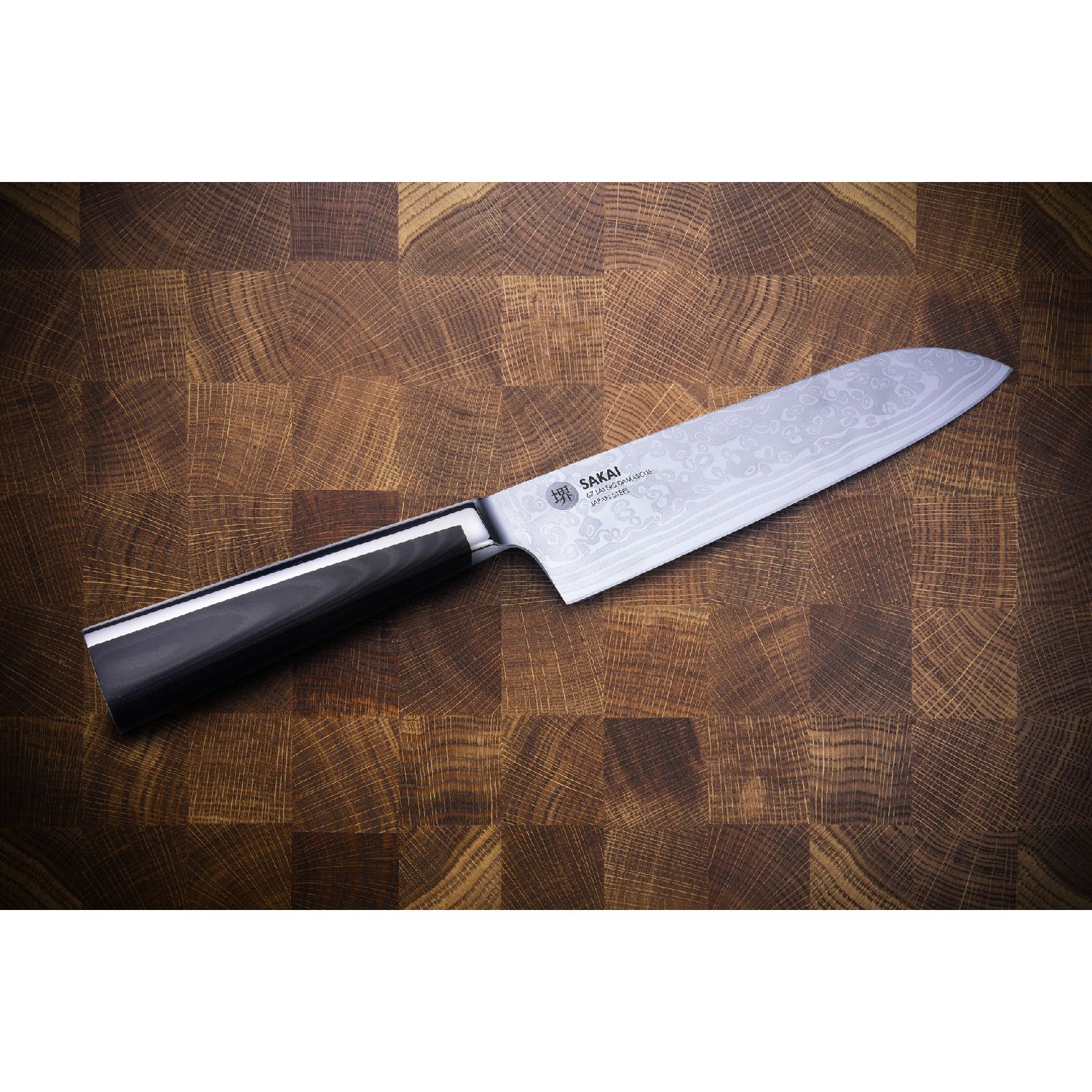 SAKAI 67 SANTOKU japonský nůž Šéfkuchaře. Délka čepele: 180 mm, celková délka: 310 mm, tloušťka čepele: 2,5 mm. Váha: 220 g