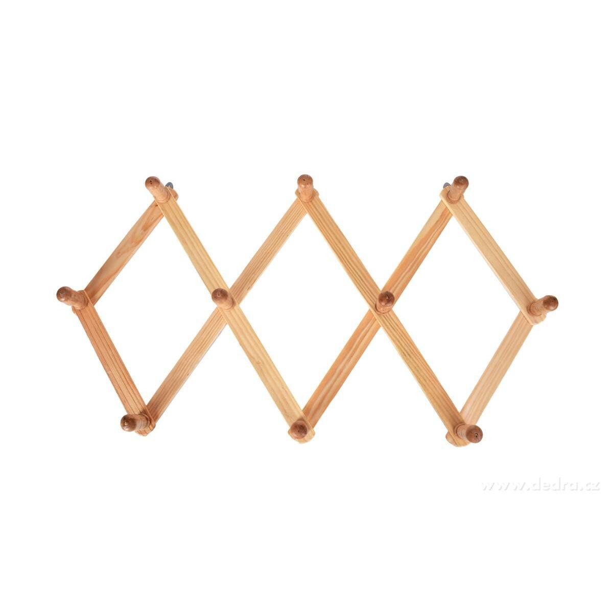 ROZKLÁDACÍ VĚŠÁK z borovicového dřeva s 10 dřevěnými háčky na pověšení.Rozměry cca š 90 x h 7 x v 33 cm (složený š 11 x h 7 x v 45 cm).