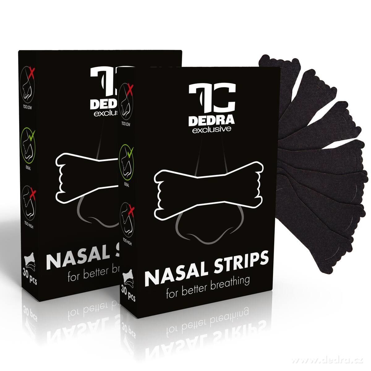 Nasal Strips – nosní pásky pro lepší dýchání. Pomáhají zmírnit pocit ucpaného nosu a mohou omezit chrápání. Ideální pro spánek, sport i při rýmě. Lehké, pohodlné a jednorázové. Dostupné v černé variantě, 2 balení po 30 ks.