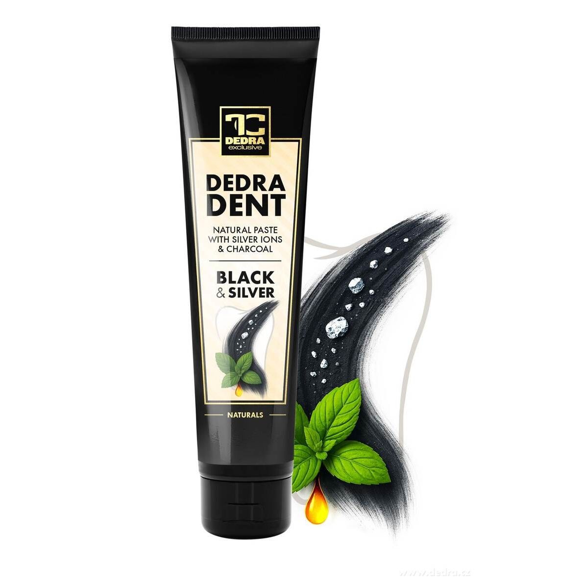 DEDRA DENT® BLACK & SILVER je přírodní zubní pasta s ionty stříbra a bambusovým uhlím pro antibakteriální ochranu, šetrné bělení a dlouhotrvající svěží dech. Mátová silice a mentol osvěží, xylitol a stévie sladí bez cukru. Bez SLS, SLES, fluoridů, parabenů a triclosanu. XXL balení 100 g pro každodenní péči o zuby a dásně.