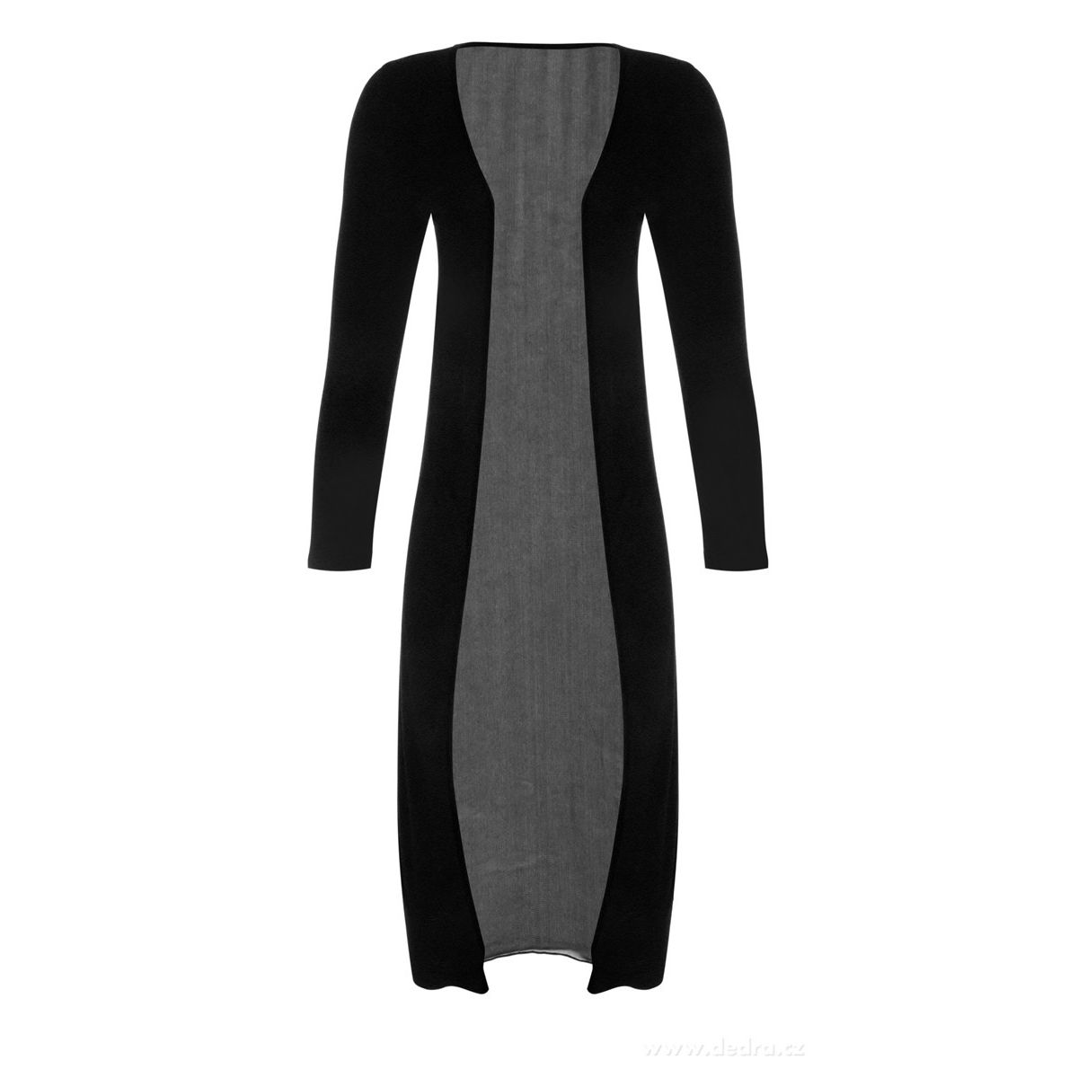 LACY černý kardigan s efektní síťovinou v zadní části, hodí se pro běžné nošení i jako doplněk večerní róby. Příjemný lehký materiál 100% PES. Univerzální velikost (odpovídá M – L). Volnější pružný střih téměř pro každou postavu. Rozměry: obvod hrudníku a boků cca 80 - 100 , max. délka cca 92 cm, délka rukávu od ramene 55 cm.