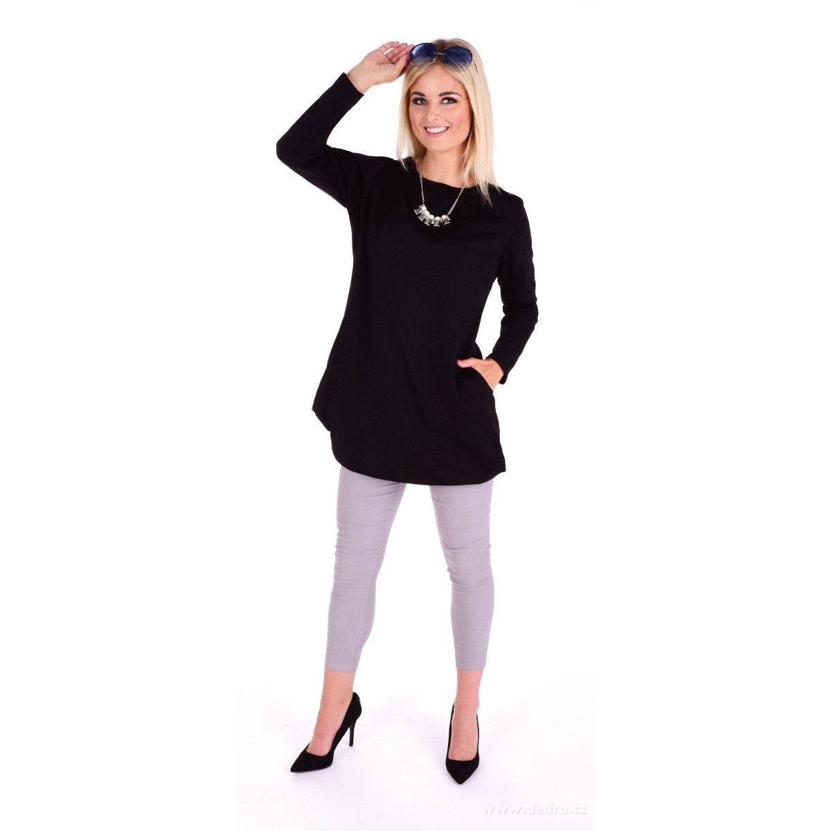 KRISTIE elegantní černé šaty/tunika s kapsami a dlouhým rukávem, se zúženým dolním širokým lemem (cca 30 cm) pro efektní podkasání a vytvoření tak volného balónového střihu písmene A.